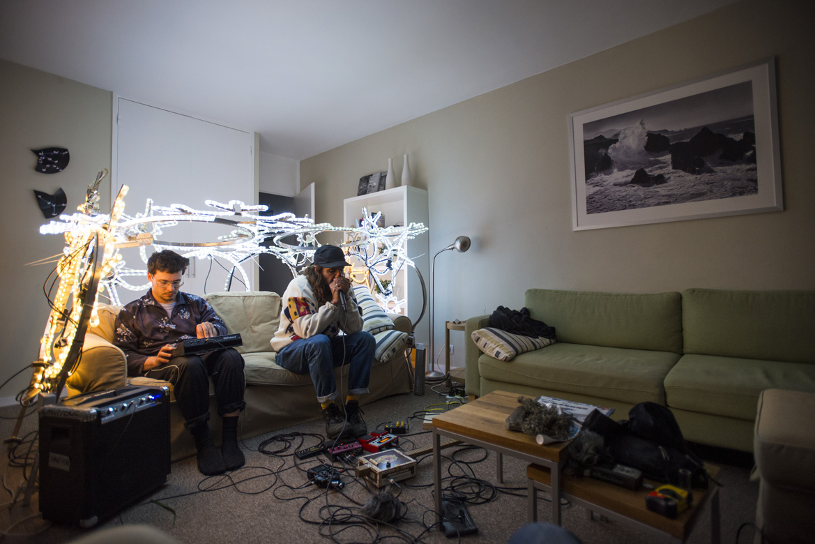EN/ Encastrable, the duo of visual artists behind the project, practice « intrusive sculpture ». They invite themselves into unexpected spaces to improvise absurd or incongruous proposals using the elements available, questioning our relationship with reality. Through their playful and accessible practice, they desacralize the artistic process while inviting the imagination. The Hitchhiker creation residency is the transposition of this approach into the field of electronic music.